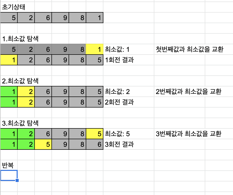 - 첫번째 순서에 첫번째 위치에 가장 최소값을 넣는다.